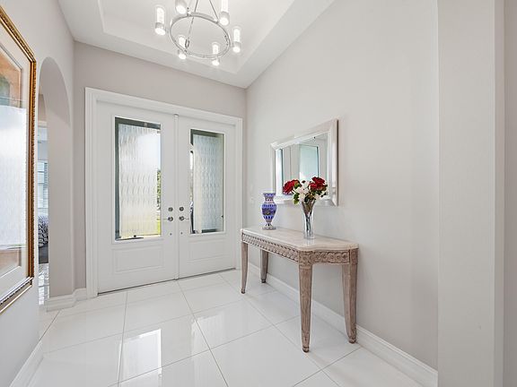 Experience exceptional waterfront living in this beautifully appointed home in the highly sought-after Palm Meadows Estates. Perfectly situated on an expansive pie-shaped lot, this residence boasts approximately 150 feet of unobstructed water views--one of the community's most impressive settings. A double impact-glass front door leads into a welcoming foyer with a tray ceiling, opening to a spacious great room also adorned with a tray ceiling and enhanced by smooth walls, neutral flooring, and abundant natural light through full impact windows. The open kitchen is designed for both style and function, featuring quartz countertops, a 5-burner gas stove, sleek cabinetry, and a large center island with granite countertops and a convenient snack bar. It's also pre-plumbed for a gas hookup outdoors, making it effortless to create a future grill or full outdoor kitchen.