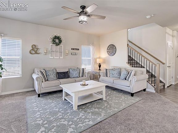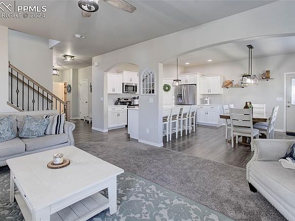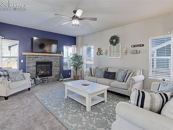 Discover this incredibly maintained in the Sterling Ranch community of northeast Colorado Springs. Built in 2019, this residence features a spacious 3-car tandem garage and a welcoming covered porch with a lighted walkway. The heart of the home boasts a stunning open concept. The living room invites relaxation with its gas fireplace and stacked stone surround. The kitchen is equipped with stainless steel appliances, quartz countertops, and a large island with barstool seating, perfect for entertaining. An adjacent dining room showcases the LVP flooring and a walk-out. Step outside to enjoy the stamped concrete patio, ideal for outdoor gatherings, and unwind in the hot tub under the pergola. The primary suite offers an oversized retreat with a walk-in closet & a 5-piece, en-suite bath featuring a garden tub and dual sink vanity. This home provides ample space for family and friends with 4 additional bedrooms and a spacious family room. The community is perfectly positioned with walking trails, parks, and easy access to the Powers corridor, providing convenience to shopping, dining, and entertainment. This home is a perfect blend of comfort and modern living, ready to welcome its new owners.
