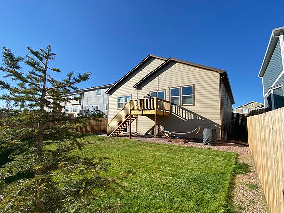 Built in November of 2019, this beautiful four bedroom ranch home is located in the community of Homestead at Sterling Ranch. The home includes upgraded laminate flooring across the entire main level, excluding the tiled bath, laundry, garage entry, and the carpeted bedrooms. This open concept home's kitchen includes upgraded granite countertops, stainless steel appliances, a walk-in pantry, and a deep single basin stainless steel sink. Stay cool in the summer with air conditioning and a large ceiling fan in the living room and one ceiling fan in the primary bedroom. The primary bedroom is very spacious, has a five piece bath, and a large walk-in closet. The view from the back porch can see some mountains through the other houses. The downstairs is carpeted completely, except the tiled bathroom and unfinished storage area, and very spacious. In addition to its large entertainment/family room, there are two bedrooms and a full bath downstairs. The basement also has plenty of storage with a large 405 square feet storeroom (unfinished), under stairs storage (finished), and a couple of extra feet in the garage depth. This home was built in the first filing of this newer neighborhood, and is found on one of the few cul-de-sacs this area boasts. There are plenty of sidewalks for strollers and walking, and a new nearby park. Within 10 minutes of Powers and Woodmen, this home is located close to many restaurant and shopping options including Costco, Walmart, Target, King Soopers, Prominade Shops at Briargate, Starbucks, Fuzzy's, Chick-Fil-A, Chipotle, and the Cinemark Theater on Powers Blvd. This home is located in the highly coveted District 20 and the neighborhood is very family friendly. Owner is available to show the property and the property is currently occupied by tenants until July 31; first available move-in date for new renter is August 9th. Renter responsible for all utilities including water, gas, and electric. Trash pick up and HOA fees already included in rent. Two dog maximum allowed (excluding certain aggressive breeds). No smoking allowed. First month's rent, security deposit, and pet fee(s) due at lease signing.