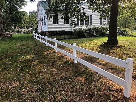Three rail, five foot tall wooden fencing keep horses safe and secure.