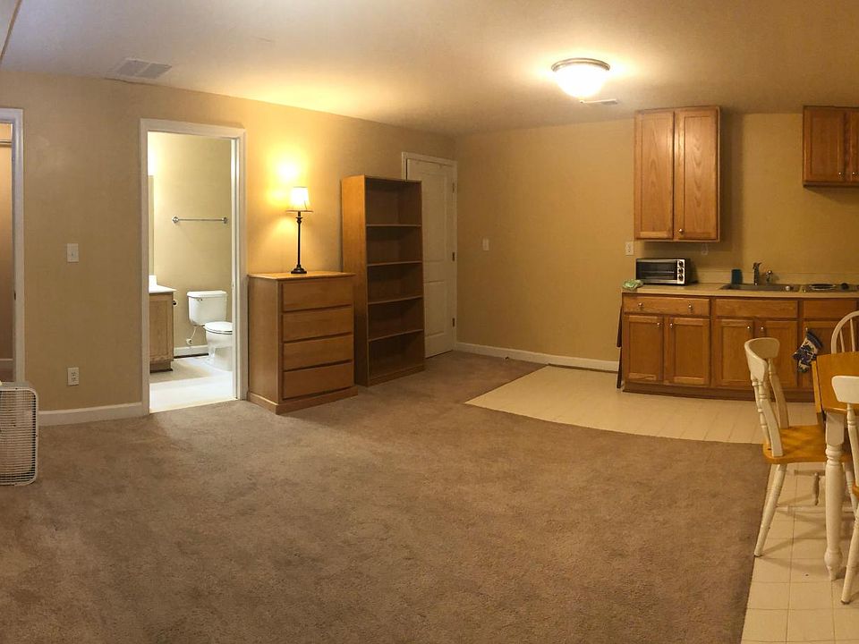 Available just for the month of February: Clean, partially furnished, basement studio apartment in the beautiful Belvedere neighborhood, 10 minutes from downtown Charlottesville. Utilities include water, electricity, central heating, and high speed internet. The kitchen has a large fridge (installed after the photo was taken), two stove top burners, sink, toaster oven, and microwave oven. Furniture includes a table with two chairs, a large and small bookshelf, night stand, dresser, and two lamps. Tenants must provide their own bed and/or couch. February only. (The house is selling in early March.) All utilities (including Internet) are $100 per person. No smoking. No pets.