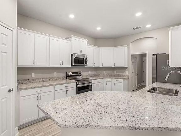 Under Construction. New construction home with 2314 square feet on one-story including 4 bedrooms, 3 baths, and an open living area. Enjoy an open kitchen with Granit countertops, Samsung stainless steel appliances, a walk-in pantry, and a large counter-height bar, fully open to the dining café and gathering room. The living area, laundry room, and baths include luxury wood vinyl plank flooring, with stain-resistant carpet in the bedrooms. Your owner's suite is complete with a walk-in wardrobe and a private en-suite bath with dual vanities, a large, tiled shower, garden tub and a closeted toilet. Plus, enjoy a covered lanai, 3-car garage, custom-fit window blinds, architectural shingles, energy-efficient insulation and windows, and a full builder warranty. “Please note, virtual tour/photos showcase the home layout; colors and design options in actual home for sale may differ. Furnishings and décor do not convey.