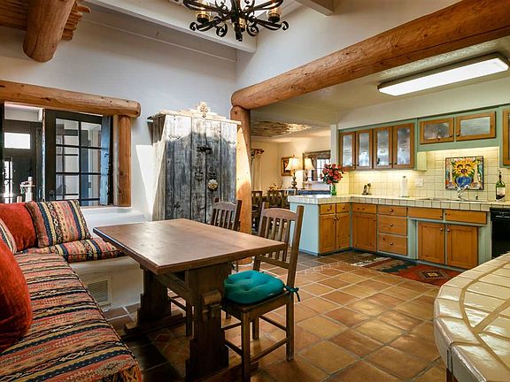 This home is warm and cozy with Old Santa Fe style and plenty of architectural interest. The classy home welcomes you in to the whimsical kitchen with bancos, gas cooktop, talavera counters and backsplash and punched tin cabinet inserts. Through this room on one side is the large dining room, which has an intricate punched tin ceiling, and on the other is the stepped down living room. Both these rooms boast sculpted fireplaces that grow organically into the room and add lots of character! Adobe accent walls enhance the warm feel of the space. The living room and dining room both open onto a sunroom area that has full size windows to create a feeling of connection with the outdoors. The big plus is the family room or dining room open to a very deep deck, a good portion of which is covered for terrific indoor/outdoor living and entertaining. The wooded lot slopes down into the hillside and is landscaped with appealing native plants on a drip. The master, which includes a fireplace, is a good size. The two other bedrooms, one of which has an ensuite bath, create a situation that can offer three bedrooms each with their own bath for guests. Following the theme of the talavera tile the home is colorful and catchy throughout. This one has a "wow" factor, surrounded by pinons, has plenty of storage including large stand up safe and is minutes from downtown. Sellers offer a "move in ready" home furnishing package under a separate bill of sale. List provided upon request.