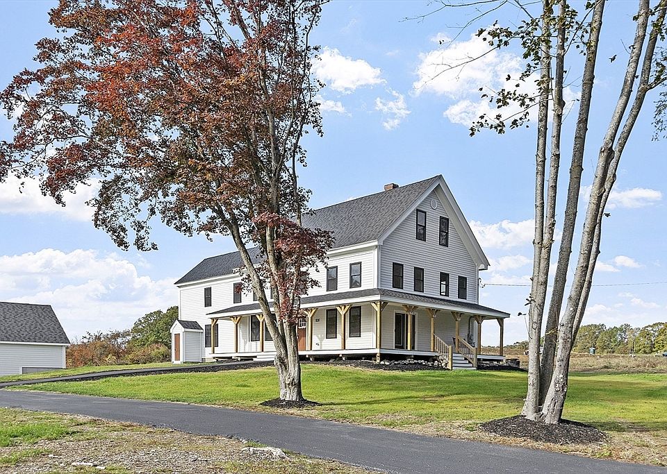 Now offered at an appealing new price! Timeless charm meets modern comfort in this completely renovated 1780 post & beam historic farmhouse. Character shines through exposed beams, brick accents and wide pine flooring. The open layout features a spacious gathering room with French doors to a wraparound porch with a porch swing, a dining room with bay window and a kitchen with stunning views and pantry. Additional main-level spaces include an office, mudroom, 1.5 baths and laundry. The upper level offers 4 large bedrooms, 2 full baths, including a serene primary suite with library, walk-in closet and private bath. Expansive walk-up attic for storage or future expansion. Set on picturesque grounds with farmland views, this home offers a large open yard and a two-car garage. A rare blend of history, style and modern comfort in a truly special New England home.