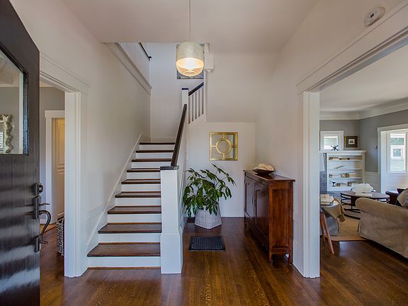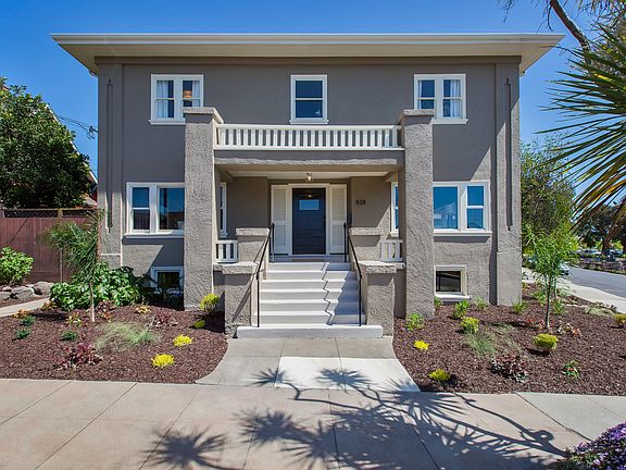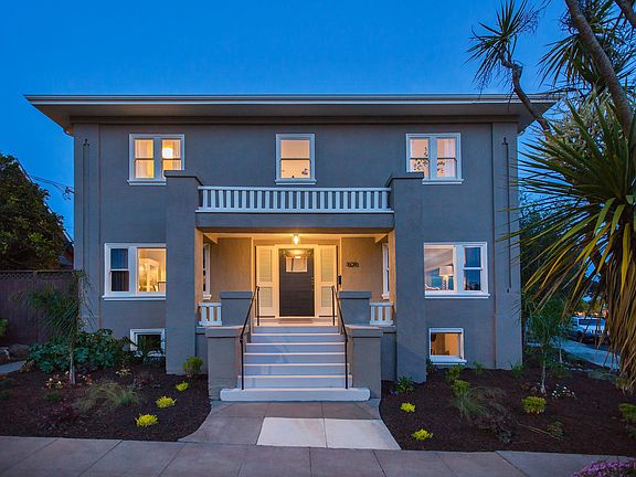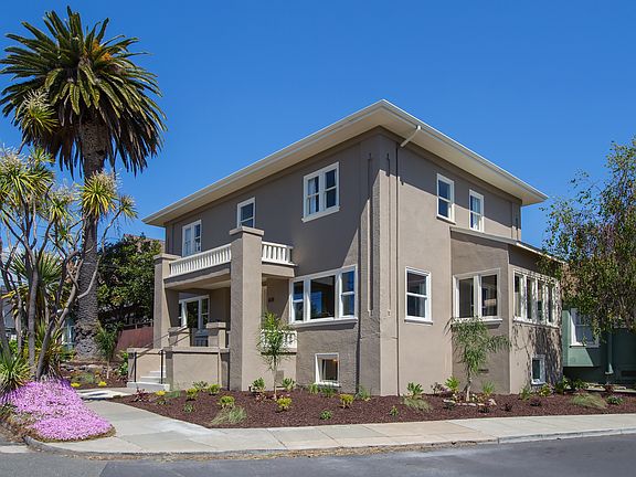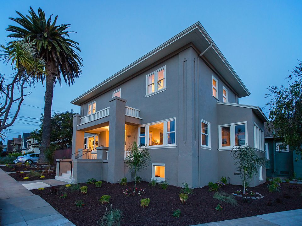 Built in 1928, this home is a true Alameda architectural gem in a prime location. Laurel Street is a showcase for 19th and early 20th century homes in desirable Alameda, and is within walking distance of the shops and restaurants on Park Street and South Shore. Superior neighborhood schools include Donald Lum Elementary School and Alameda High School. With beautiful and classical proportions, this gracious stucco house is a melding of the American and Prairie Foursquare styles and sits on an attractive corner lot. The substantial front steps lead to a generous front porch that is covered by an ornamental balcony, while new drought tolerant landscaping enhances the house’s striking curb appeal. Inside, the home has many original period details in the formal living room, formal dining room, eat-in kitchen, powder room, finished basement, three bedrooms and one bathroom. Newly refinished hardwood floors throughout the house and original, double-hung windows add elegance to this special vintage home. The large foyer opens to a beautiful staircase that is a prominent interior architectural feature of the home. To the right of the staircase is the formal living room, complete with a wood-burning fireplace featuring a ceramic tile facade and original wide, built-in bookshelves on either side of the fireplace. Crown moulding and wainscoting give the room elegance and enhance the structure and design of the room, as does the period framing on the window and door casings. Large picture and double-hung windows flood the room with light, as do the charming clerestory windows that flank the fireplace. A lovely architectural feature of the living room is a small sunroom bay that is large enough for separate seating and framed by windows on all sides, perfect for enjoying the lagoon views and sunsets. The size and charm of the formal dining room is in perfect symmetry with the living room and, like the living room, is spacious enough for formal entertaining. Period details include crown moulding, a box beam ceiling, and a fixed picture window framed by double-hung windows. Built-in display hutches with glass fronts and beadboard backs are on either side of a built-in sideboard, and a wide clerestory window above the sideboard adds finish and more light to the room, as well as views of the palm and orange trees outside. The kitchen is located just off of the dining room, yet also connects to the living room and has been recently updated to include quartz counters, recessed lighting, and a brilliant white tile backsplash. The freshly painted kitchen has plenty of cupboards and a breakfast nook with a built-in window bench seat and new pendant lights. The large double-hung windows and additional sidelights provide plenty of natural light. A jewel-like powder room is off of the kitchen, as is access to the backyard and finished basement. This passageway has a high ceiling, oversized windows and original beadboard wainscoting. At the top of the stairs to the upper level is a formal landing that is large enough for a small desk or seating area. On the left is the spacious master bedroom that features numerous windows and two closets, one of which has a built-in, beadboard-paneled shoe cupboard. Both closets are spacious and have small, double-hung windows that provide natural light and can open for ventilation. The second and third bedrooms on the upper level are both generous, and each has numerous windows for light and cross-ventilation. There is an original linen closet between the two bedrooms. The full bathroom on this level opens to the hallway on one end and the master bedroom on the other end. The bathroom consists of a single sink, a second sink with vanity, and a Safe Step Walk-In Tub. The bathroom is spacious enough to be redesigned for today’s modern family needs and has potential to be divided into two bathrooms, creating a master suite as well as a hall bathroom.