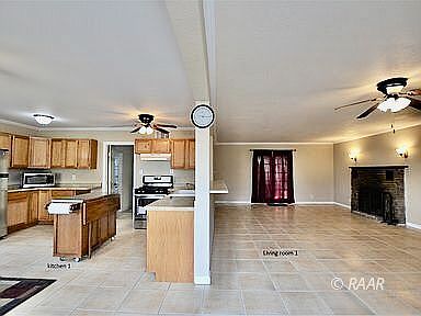 - Ceiling Fans, Window Coverings, Fireplace, Fixtures, Flooring- Carpet, Flooring- Tile