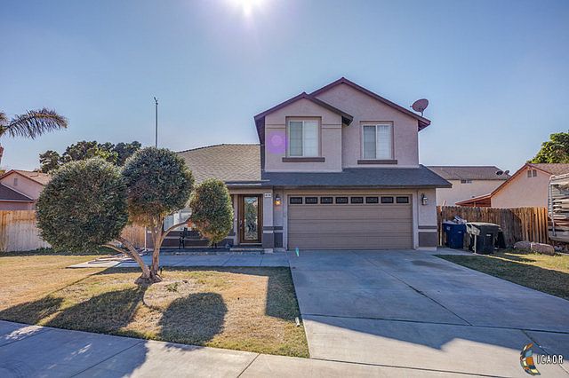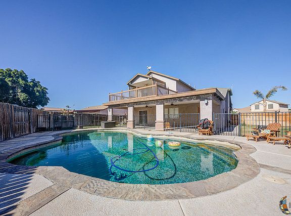 Beautiful home in Parkside in Brawley! SPARKLING POOL is ready for spring which is sooner than you think! The sellers just moved out and the home has a fresh new look with brand new paint throughout. This home was modified so there is an extra den downstairs so the kitchen area is enlarged with extra custom cabinetry including a built in media center, desks, and island with wine racks all topped with stone countertops and full height backsplash. Not only does the backyard have a gorgeous pool, but there is landscaping on both sides, a covered patio, and a balcony accessed by the master bedroom upstairs. Other great features include ceiling fans throughout, plantation style shutters, custom entry door, 2 car garage, laminate wood floor recently installed in all the bedrooms, mirrored closet doors, indoor laundry room, full bathroom downstairs, custom light fixtures, and more!