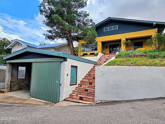OLD BISBEE Historic 1,607 sq ft, Three Bedroom/Two Bath, Craftsman Style Home, Garage and Workshop, Solidly Built in 1913. With Poured Concrete Exterior Walls (from the foundation to the metal roof), Original Maple Flooring, Vast Great Room, Primary Bedroom Suite with Clawfoot Tub, High Ceilings, Terraced Yard and Gardens, and 320 sq ft. Front Porch with Panoramic Mountain Views.