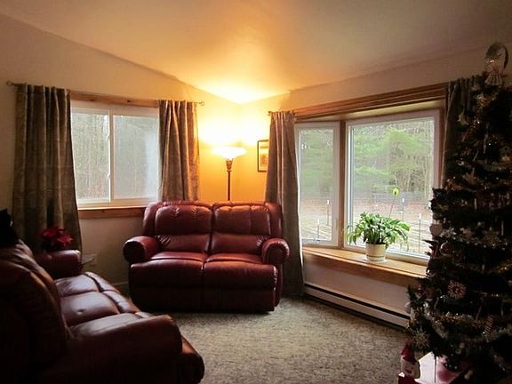 COMPLETELY PRIVATE raised ranch with mostly finished lower level. Kitchen/dining combo with new sliding glass doors leading out to huge deck! Living room with lovely view from the bay window. Three bedrooms & one full bath on main level. Lower level has family room with coal stove, full bath, bedroom & laundry room. Three car garage with workbench, storage & coal bin. Nice yard, raised flower beds (fenced in) and property surrounded by acres of woods! Many updates and very clean. Very close to the Finger Lakes Wine Trail!