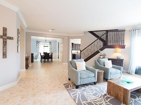 Coastal in Canyon! This well laid out home offers many upgrades which include high hat lighting throughout, crown molding, upgraded light fixtures, travertine deck, screened balcony off of the master suite which overlooks the lake. There are granite countertops, and marble in the master bathroom. Many of the closets have custom built organizers. There are roll down shades on the large sliding glass windows, and window treatments throughout. Enjoy sports fully with the multiple TV's in the loft. All flooring throughout just professionally cleaned, and tile grout done. Enjoy the lake breeze while practicing your putt! Canyon Trails is a great family neighborhood with a full gym, pool, clubhouse, tot water lot, and guarded entry. Schedule today!