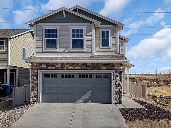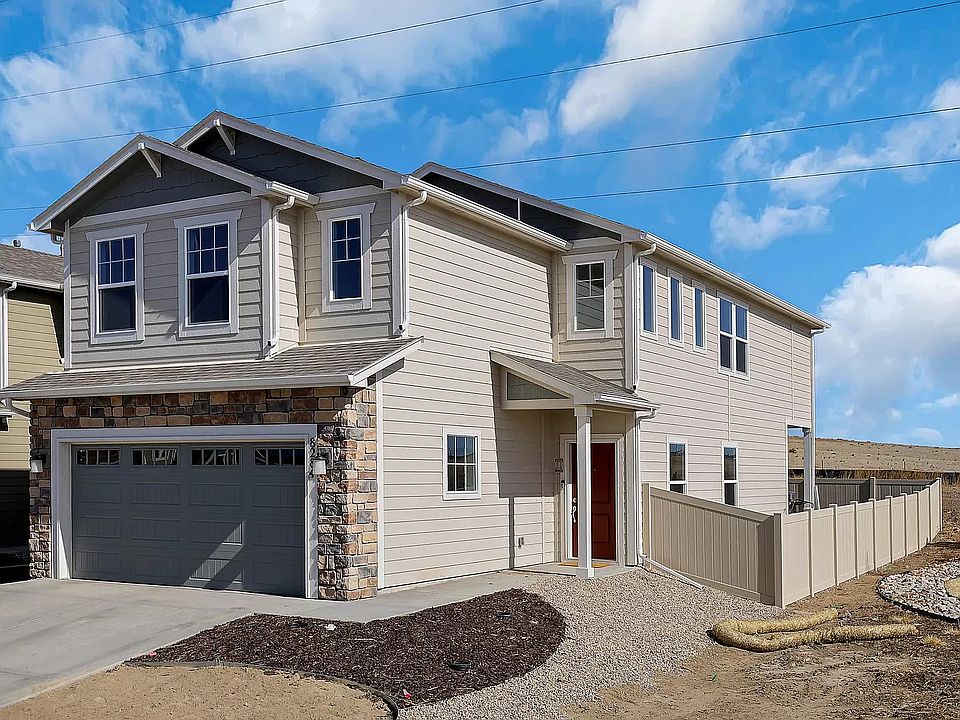Newly completed in 2022, this 3 bedrooms, 2.5 baths home sits in a highly desired location, just minutes to K-12 schools, medical facilities, shopping centers and military installations, such as Peterson & Schriever SFB. Upon entrance, you are warmly greeted by beautiful wood laminate floors, high ceilings, and rich natural light, an open floor plan seamlessly connecting the kitchen to the living room. Glass sliding doors open to a private yard with a covered back porch offering captivating views of blue skies and open fields. Meticulous attention to detail is presented in the kitchen with a large island, quartz countertops, customized backsplash, soft-closing cabinets, and stainless steel appliances. Upstairs, you'll find an expansive bright loft, a laundry room, 2 full baths, and 3 spacious bedrooms, each with its own walk-in closet. Applicant has the right to provide Landlord with a Portable Tenant Screening Report (PTSR) as defined in 38-12-902(2.5), Colorado Revised Statutes; and 2) if Applicant provides Landlord with a PTSR, Landlord is prohibited from: a) charging Applicant a rental application fee; or b) charging Applicant a fee for Landlord to access or use the PTSR. Landlord may limit acceptance of PTSRs to those that are not more than 30 days old. Confirm PTSR requirements directly with Landlord. This property is owned and managed by a private individual. Tenant placement and advertising services are provided by licensed Real Estate agents Amber Dregalla and Kaitlyn Hogan, who are affiliated with The Kamberton Group, operating under Realty One Group Apex.