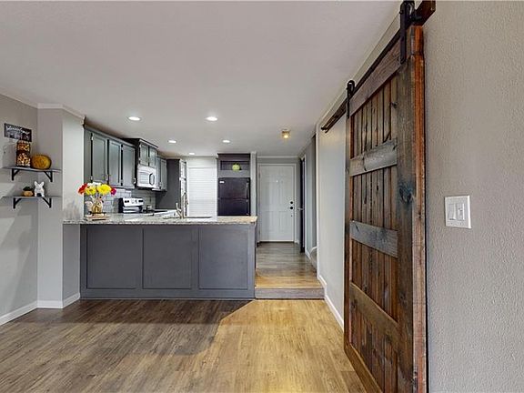 Discover this wonderful townhome nestled in the heart of Lenexa, KS, boasting updates throughout. Enjoy the charm of a stone fireplace, granite counters, and stainless steel appliances. The family room has an inviting stone fireplace and a stylish barn door. Large bedrooms with vaulted ceilings. Updates throughout. Revel in the warmth of wood flooring and unwind on the cozy back porch with new decking. Additional features include an exterior storage shed and an unfinished basement area offering great equity opportunity. Customize this space to your liking and create the home of your dreams!