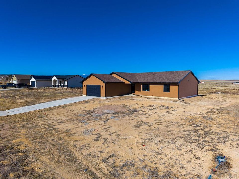 Welcome to this stunning brand-new build in Pueblo West! This beautifully crafted three-bedroom, two-bathroom home offers a perfect blend of modern design and functional living. As you step inside, you are greeted by an open and airy floor plan that seamlessly connects the living, dining, and kitchen areas, perfect for entertaining or relaxing with family. The oversized master bedroom is a true retreat, complete with a luxurious en-suite bathroom and large walk-in closet. Sitting on a generous 1-acre lot, this property offers plenty of room for outdoor activities, gardening, or future landscaping projects. The two car garage provides convenient parking and additional storage space, while the ample closet space throughout the home ensures you have room for all your belongings. Schedule a viewing today and experience all that this beautiful home has to offer!