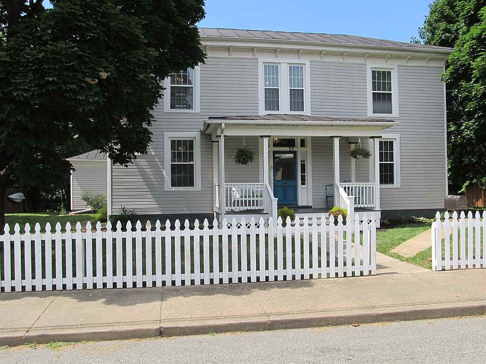 Beautifully Restored Home ca. 1877 with original mantles, fireplace, molding and oil painting over the fireplace. First floor features an entry foyer and front hall, large living room, dining room, tastefully updated kitchen and baths. Upstairs has 3 bedrooms, full bath and laundry. Many updates including new plumbing, new windows, insulation , 200 amp service, upstairs heat pump, lower level has natural gas heating with A/C (2 yr old), roof painted in 2017, and more. Nice back porches, fenced back yard with creek for a rural setting. Storage building for easy assess to lawn and gardening tools. Stroll down the sidewalk all the way to downtown. This is a must see.