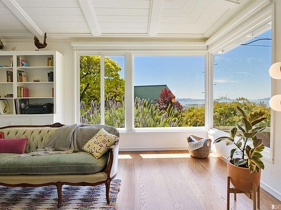 This architecturally splendid sun-drenched mid-century modern home features an abundance of windows and doors leading to enchanted yards on all sides for seamless indoor-outdoor flow. The living room and master bedroom frame Bay views, San Francisco, and the Golden Gate Bridge, and share a large ipe wood deck. Bonus room with skylight and its own entrance create a perfect 4th bedroom, guest suite, or home office. A finished basement room below provides ample storage or potential art or music studio. Hardwood flooring & tall dynamically patterned plank ceilings enhance the home's integrity. Located just up the hill from North Berkeley and Solano Avenue and down the hill from Tilden Park, this lush, oasis is surrounded by privacy hedges & landscaping. Upgrades include retrofitted foundation, new heating system, outdoor spa, solar panels (owned) remodeled open plan kitchen with Wolf gas range, and renovated bathrooms. A perfect home with space to grow, and close to everything one needs.