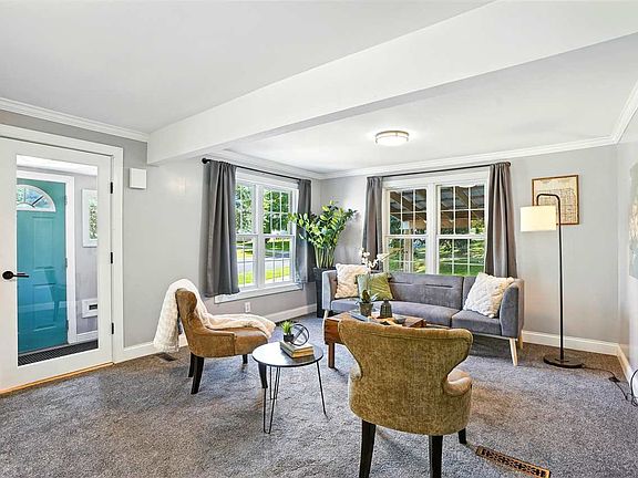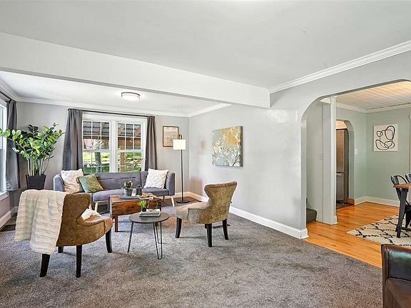 Spacious 1½ story bungalow nestled in a great location. This adorable home is loaded with charm! Updated kitchen with white cabinetry, black countertops, and black hardware accented with industrial style farmhouse lighting and stainless-steel appliances. Inviting and cozy open floor plan between the formal dining room and living room. Dining room features refinished hardwood floors and painted white knotty wood ceilings. Enjoy soaking up the natural sunlight in the living room. White painted trim and arched doorways. 1st floor office or primary bedroom with French doors with antique hardware, refreshed hardwood floors, and a beautiful view of the backyard. Remodeled main floor bathroom with a tile walk-in shower. The upper-level features a private and quiet oasis with a large bedroom, walk-in closet and sitting area, and private bathroom. Tons of storage in the lower level and the washer/dryer are staying. Home has been mitigated for radon and features newer windows. Enjoy relaxing on the back patio in the newly fenced-in backyard. Newer carport and garden shed! Truly a must see gem!