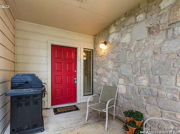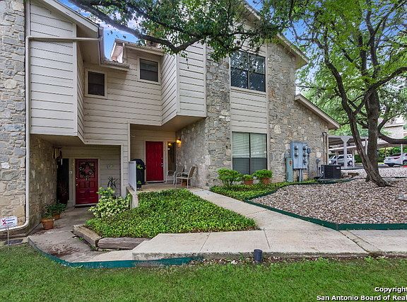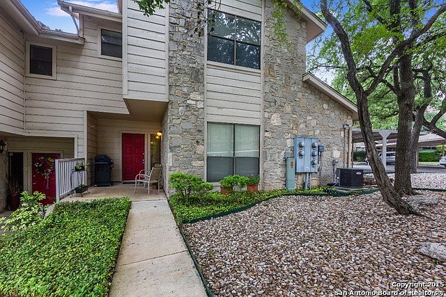 You will instantly feel right at home in this beautiful 2-bedroom townhome-style condo. Quiet secluded gated complex, with lots of mature trees, conveniently located near 281, the airport and lots of shopping and restaurants. Kitchen and separate dining room overlook living room with fireplace. No carpet in living areas. Double vanity in master bath. 2 premium (1 is covered) parking spots located right outside your door. Condo located close to the pool. Come see this absolute beauty in a desirable location