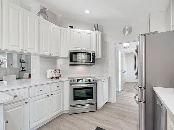 Discover this beautifully updated 2-bedroom, 2-bathroom Capri model villa located in the highly desirable, resort-style community of VillageWalk in Wellington, Florida. Offering over 1,500 square feet of well-designed living space, this move-in-ready home features modern finishes, a private resurfaced pool, and tranquil lake views--all ideal for those seeking comfort, convenience, and a low-maintenance lifestyle.Inside, you'll find brand-new white quartz countertops in the kitchen, bathrooms, laundry room, window sills, and dining room built-in. The updated kitchen includes KitchenAid stainless steel appliances, white cabinetry, and contemporary hardware. Both bathrooms have been thoughtfully renovated with quartz vanities, updated faucets, and glass shower/tub doors. Luxury vinyl flooring flows throughout the entire home, providing durability and a clean, modern look.