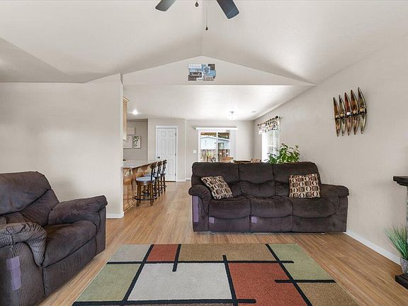 Charming 3 bedroom 2 bath home with open floor plan! This beautiful home features a spacious living room with vaulted ceilings, creating an airy and inviting atmosphere. The kitchen boasts granite countertops, a breakfast bar, and ample cabinet space. The large primary bedroom offers plenty of room to relax, featuring a spacious en suite bath. Step outside to the concrete and paver patio, perfect for entertaining and enjoy the convenience of sprinklers in both the front and backyards. Huge RV parking! Don't miss out on this move in ready gem!