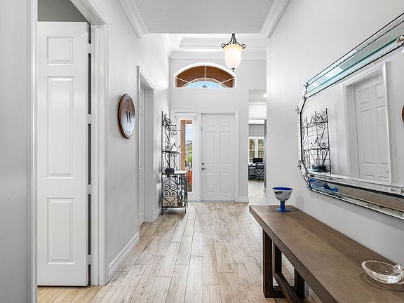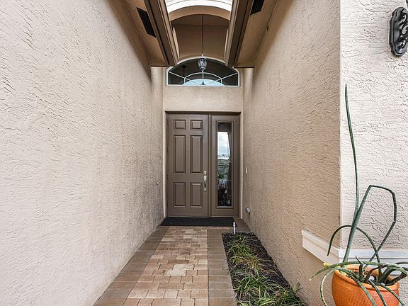 This popular open concept Atlantica model has a split bedroom plan and sits on a lushly landscaped private lot. The beautiful home, with two bedrooms plus den and two and one half baths, features impact windows, newish A/C (Daikin 3.5 ton unit installed 10/2023), ''wood-look'' porcelain plank tile throughout, recessed lighting, crown molding, fans, plantation shutters, upgraded baths and more! The gourmet kitchen has white wood cabinets, quartz countertops, white subway tile backsplash, stainless steel appliances, a built-in pantry and all the bells and whistles! The large counter-depth snack bar and breakfast nook are perfect for casual dining. The kitchen is open to the great room and dining room - perfect for entertaining. Enjoy your morning coffee on the covered screened patio! Valencia Cove is a premier 55+ lifestyle community featuring a spectacular 39,000 square-foot clubhouse and 10 acre outdoor recreational facility. Endless activities and opportunities for fun abound - there are activities, trips, shows, and clubs of all types. The clubhouse features an expansive foyer and lobby, grand ballroom with raised stage and dance floor, four spacious card rooms, Cafe with indoor/outdoor seating, Arts and crafts room with kiln, Internet/Billiards room, Office, Catering kitchen with separate demonstration cooking studio, Yoga & exercise studio with ping pong, fully equipped fitness center and men's and women's locker rooms with steam rooms, massage room and showers. There are four pools - a beautiful Resort-style pool and Shade Pavilions, Lap pool with Swimmers' Lap Lanes, Resistance walking pool, Grandchildren's wading pool, and an Outdoor whirlpool spa. There are eight har-tru tennis courts with shade pavilions and lighting for night play, tennis pro shop, tennis pro, league play, six pickleball courts, pickleball pro, league play, 2 bocce courts, league play, half-court basketball and walking/jogging/biking paths throughout and just outside the community. Valencia Cove is conveniently located near shopping, restaurants, houses of worship and major highways!
