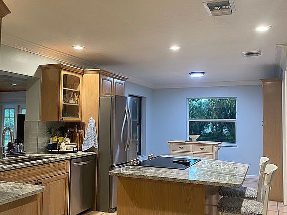 (Realtors--see note below.) Beautiful, large home on more than an acre, 1 mile from both the Turnpike entrance and the entrance to I95. Walking distance to 3 grocery stores, shops and restaurants. Only a 6 mile drive to the beach. Huge master bedroom with large, updated ensuite bath. Three other spacious bedrooms, one with ensuite bath. Large sunroom with French doors and vaulted, cypress ceiling overlooks large deck and pool and provides extra living space for today's lifestyle. New (1 year old) roof and gutters. Fresh exterior and interior paint. Ceiling fans throughout---window shades, all new. No HOA! No city taxes. (Note: Realtors protected at 2% provided they initiate contact for buyer and immediately advise seller of representation.)