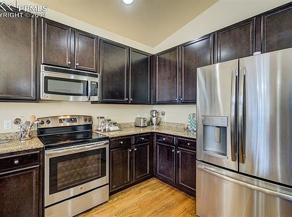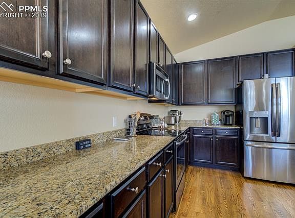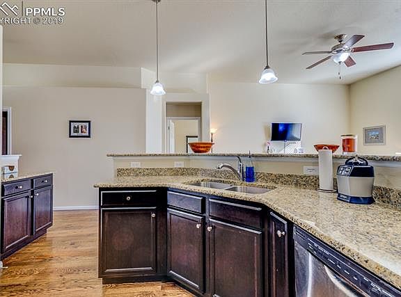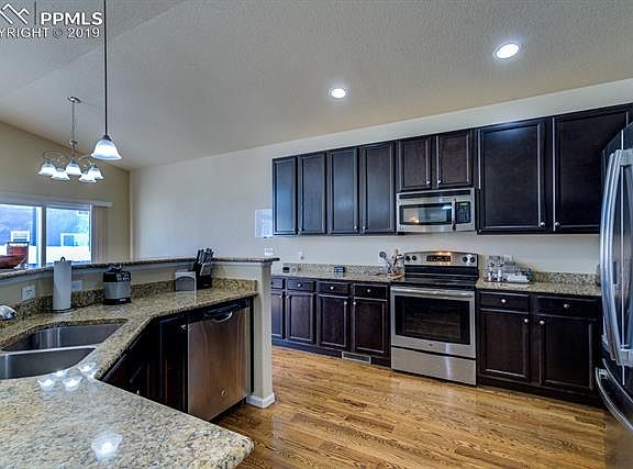 WELCOME HOME to beautifully maintained ranch home in Cumberland Green subdivision! Main level living with open and bright floor plan, the kitchen features stainless steel appliances, granite countertops, counter bar and opens to dining area and living room, the dining area has walk to large backyard with mountain views. The master bedroom has adjoined 5 piece bath and large walk in closet, there are 2 additional bedrooms and full bath. The finished basement has large family room, there are 2 additional bedrooms and full bath. It is conveniently located to schools, parks, shopping and Fort Carson. Don't miss this gem, call for your private showing today!
