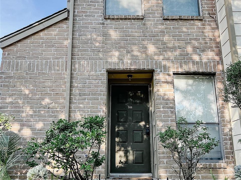 The kitchen features upgraded granite countertops, white subway tile backsplash, and tile flooring. The layout flows into the dining and living areas, creating an open feel. The main level offers vinyl plank wood-style flooring and a powder room with granite surfaces, a framed mirror, and updated fixtures. A private patio extends from the living area and includes a storage room. Upstairs, the bedroom is expansive with high ceilings and a walk-in closet. The bathroom includes granite finishes, tile flooring, and modern fixtures. The gated community offers a pool area for residents.