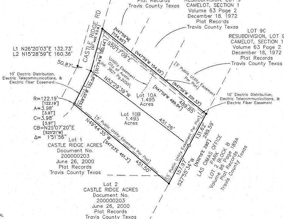 Rare opportunity in Eanes ISD! Newly subdivided 1.49-acre homesite in the desirable Camelot community. This parcel (Lot 10B) offers level build pads that transition to a gentle slope, providing an ideal setting for a custom estate. Enjoy excellent tree cover, rear privacy, and potential downtown views from a second-story design. Existing home on the property will be removed by seller after the first lot closes—remodel or start fresh with your dream home. Plat available in documents.