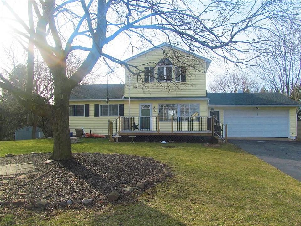 ADORABLE house on quiet street in Village of Hilton w/ gorgeous sunset views. Lives like a ranch (large BR for a 1st floor master/kid suite, could be 3 BR - wall removed to make large BR). 2nd Floor add. ('95) feat. HUGE loft Master BR w/full BA, walk-in closet & bay window (sunset-facing!) Open concept kitchen to family rm ('15) & finished basement (w/full walkout) round out this great house . During summer, enjoy your neighbors frm front porch ('17) or entertain in fully fenced yard w/large 2-tier deck & AG pool! Yard feat. enclosed area for pups to enjoy (w/shade!), 2 sheds & outdoor shower for grassy feet & muddy paws! Updates baths, roof *'13, lower) basement floor & barn door ('18), driveway ('17), appliances ('15), shed roof('18).