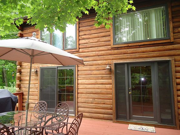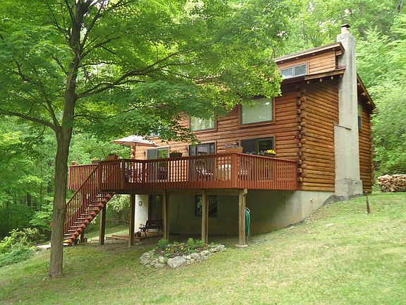Wonderful Contemporary LOG Trilevel perfectly situated on 4.3 PRIVATE, wooded acres backing up to the Appalachian trail on a country road in beautiful Warwick. Large windows & sliding glass doors to huge deck bring the scenic outdoors IN! You'll be impressed with the Great Room with cathedral ceiling and raised hearth brick fireplace; Master Bedroom with cathedral ceiling and master bath with skylight, two more large bedrooms with sloping ceilings, you'll love the kitchen with oak cabinets, ceramic tile floor & island with Jennair cooktop & tiled counter with breakfast bar. Walk out finished lower level with family room and large storage area..