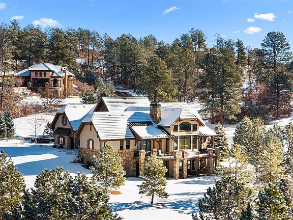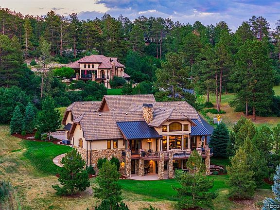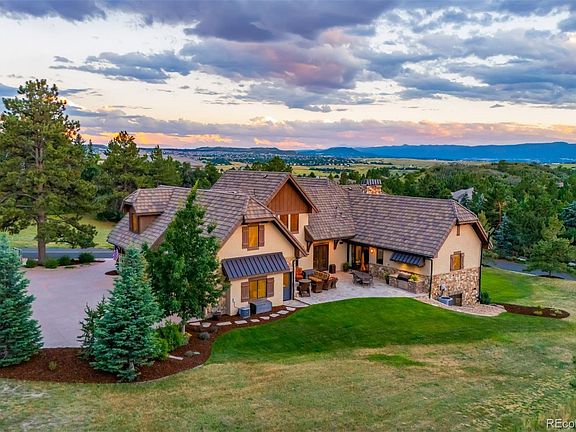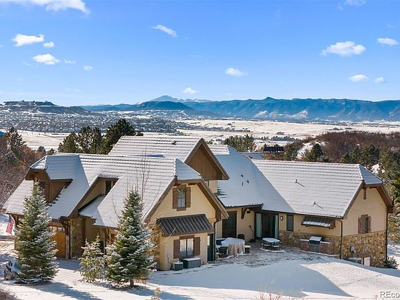 NEW PRICE for this stunning 5 bed | 7 bath mountain contemporary sanctuary in the coveted, gated Village at Castle Pines. This gorgeous gem, nestled on a private corner lot, offers exceptional mountain and sunset views. With a design that emphasizes quality and comfort, this residence is both an entertainer's dream and a family haven. Step inside the grand foyer to discover an open concept layout accented by natural stone and wood beams. The great room boasts soaring vaulted ceilings and a gas fireplace with stone surround. The kitchen, with upgraded appliances, granite counters, and custom cabinets, is the heart of the home and extends to a dining area that opens to an expansive mountain-view deck. The main floor primary bedroom is a true sanctuary with a private, covered deck, patio access, huge en suite bathroom, and walk-in closet. An incredible exterior courtyard with gas fireplace and flat yard, perfect for a dog or pool, is an ideal spot for wildlife viewing and cozy evenings under the stars. A powder room, laundry room, and oversized 3-car garage complete this level. Upstairs, a guest suite with a separate sitting area | office provides a private cove for visitors. Lower level highlights include a recreation room with wet bar and wine storage that opens to another patio and 2nd yard. Three en suite bedrooms, a dedicated workout space, and a powder room round out this floor. Adjacent to protected land, this lot is beautifully landscaped and accented by pine trees, perennials, and annuals. Custom features include solid core doors, a hand trowel wall finish, and plantation shutters throughout. This exceptional residence, blending mountain living with modern luxury, is the crossroad of tranquility and sophistication. Every detail, from the custom features to the expansive outdoor entertaining spaces, has been thoughtfully designed to create a home that’s as functional as it is beautiful, providing the ultimate in luxury living in this incomparable retreat.