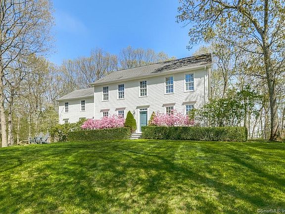 First time to market for this colonial, custom-built by award-winning builder Scott Buddenhagen. Stunningly sited for amazing views in a wonderful neighborhood, the open light-filled home welcomes you with a center hall flanked by a sitting room (flex space for office/living room)and stately dining room, both adorned by French doors. All avenues lead to the heart of the home: a spacious kitchen surrounded by a large granite peninsula (perfect perch for snacks/food prep), an adjacent casual dining area, and the sun-drenched family room where a majestic stone fireplace beckons. French doors open to a bluestone patio and sweeping lawns. The layout does double-duty providing cozy family/office spaces and the perfect easy-flow venue to entertain. Reclaimed wood floors throughout. A side front entrance opens to a casual foyer with half bath tucked away and large mudroom and pantry. Upstairs 4 spacious bedrooms offer beautiful views and large closets. The primary bedroom has a vaulted ceiling, walk-in closet, and ensuite bathroom with large tub. A roomy family bathroom with linen closet and hall closet complete the upstairs. The lower level has a playroom/office, laundry room, and abundant storage. Over the 2-car garage is a walk-up bonus room with soaring ceilings and amazing potential for expansion (approx 820 sf) Move right into this quality-built home near Weston's top-rated schools, recreation facilities, private clubs, Lachat Farm, hiking trails & access to Westport beaches.