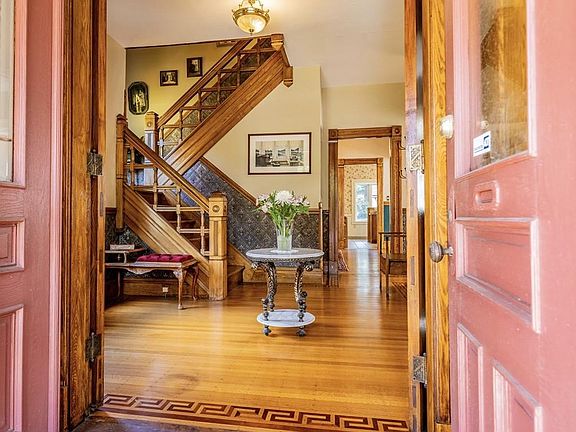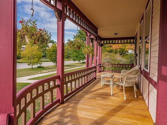 An abundance of character in this historic home! Enter through original double doors with stained glass windows into a noteworthy foyer with hardwood floors and stunning staircase. Original hardwoods with inlaid detail continue throughout most of home. Pocket doors enclose the cozy family room with fireplace. Formal living room has large windows and a beautiful fireplace with tile accents. Spacious dining room perfect for entertaining. Kitchen is light and bright and has a center island with breakfast bar. Laundry and half bath on the main level. A bow window overlooks the oversized back yard. Second floor offers four bedrooms - large master, another large bedroom with its own fireplace, another bedroom tucked away offering privacy and a fourth bedroom with its own sitting/sunroom! Full bath on second floor. Open style third floor with full bath offers potential for a remarkable guest suite. Many replacement windows, stunning front porch, oversized lot, two car garage and patio area.