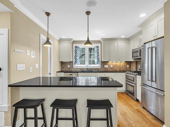 Sun-filled 3,000+ sq ft with hardwood floors, bright living room with fireplace, and a modern kitchen with granite counters and stainless steel appliances. Finished basement for office, gym, or playroom. Private backyard and patio. In-unit laundry. Garage plus driveway parking. Central A/C and efficient gas heat.