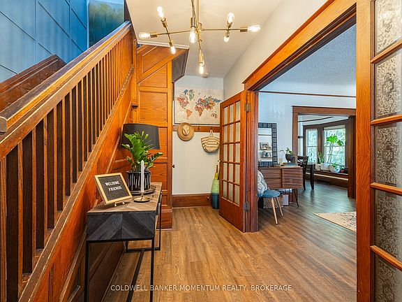 Welcoming foyerOriginal gumwood trimHigh baseboardsClassic layoutLead glass windowsFormal dining roomBig bay window