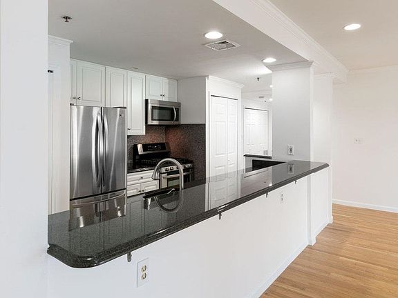 Nestled over treetops in the heart of downtown Hoboken, this expansive 1245sf two bedroom home is truly a rarity. Located in a modern, boutique condominium, one easy flight of stairs bring you into an oversized living room with dining area that features picturesque townhouse views from charming bay windows. Just off the living room is a relaxing covered terrace. The open chef's kitchen is a dream, replete with glistening white and gray quartzite countertops, a full suite of GE stainless steel appliances (gas range/oven, refrigerator, dishwasher and microwave) as well as a wine fridge! Ample counter space, custom cabinetry and a breakfast bar make this a destination for entertaining. The ideal layout of this home features a king size primary bedroom with a renovated ensuite bathroom and walk-in closet. On the other side of the home, one encounters the second bedroom- king sized as well- with a large closet and lots of light. A second, renovated bath, is just steps away. Ample closet space also houses a stacked W/D. Other details include hardwood floors, recessed lighting, ceiling fans, lots of natural sunlight, and the condominium has two guests parking spots available as well! The cherry on top is your very own covered parking spot in the garage, included in the rent. Close proximity to PATH trains, eateries, shopping and more! Currently converted into a 3BR, this home will return to its original glory, and will be available for mid-February/March 1st occupancy. Small pets OK. Shown by appointment.
