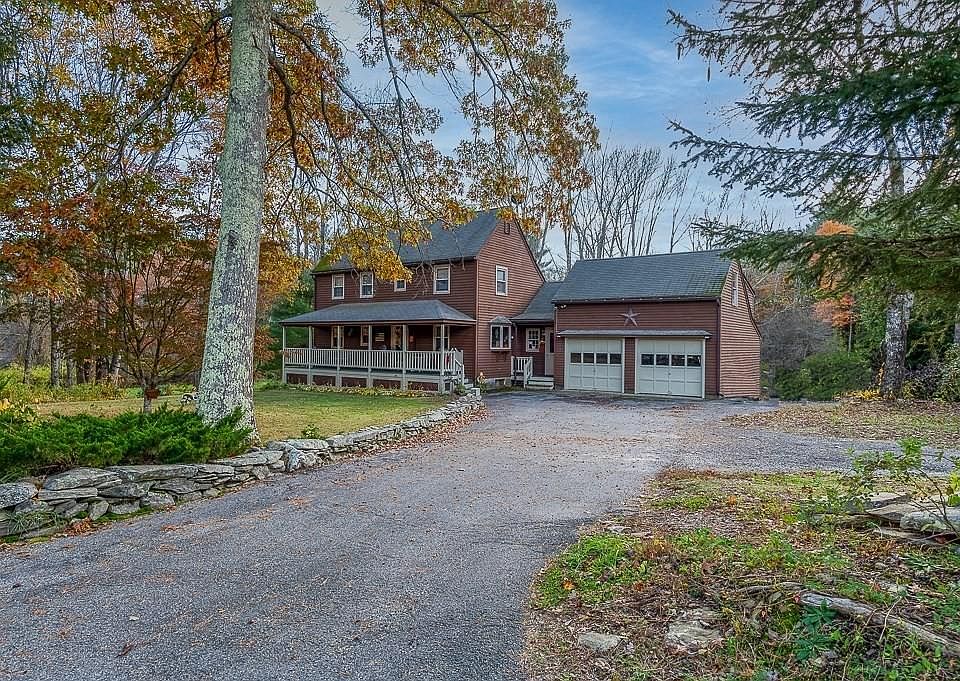 Welcome Home to this Beautiful 3 bedroom 2 bathroom Reproduction Colonial. Tons of character and charm on a level 2.84 acre lot in a lovely country setting with water views of Hayden Pond. Inviting farmers porch, wide pine floors, wood doors, and beams. Kitchen has new stainless appliances with farmhouse sink and unique concrete counters. Mini splits for heat/ac and pellet stove. Dining Rm with a Bay Window, First floor bedroom or office & a full bath. Open staircase with modern black railings. Family Room w/Cathedral Ceilings and beams. Upstairs has two additional nicely sized bedrooms & another full bath. Potential for finishing and extra storage in the basement area. Oversized attached two car with walk up loft storage space. Large bonus breezeway mudroom connects to kitchen and garage. This home has so much to offer!