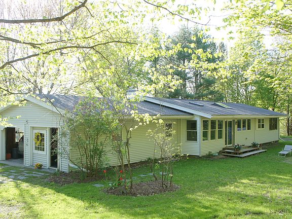 Fabulously remodeled 3 bedroom, 1 3/4 bath one-level home on over 3 acres provides country living at its best. With over $100K in upgrades, this home boasts a fabulous open floorplan with vaulted ceilings, hardwood floors, and a cozy fireplace. New high-end Pella windows and skylights flood the space with natural light on all sides creating a bright and sunny retreat. The new cook's delight kitchen features classic maple cabinets, stainless steel appliances, and a gas cooktop. The office/den with a partial natural brick wall allows for privacy. The rec room has knotty pine walls and slate flooring. Backyard out building with workshop and loft, plus additional large garden shed. New insulation, windows, skylights, plumbing, electric, Culligan water filtration system and economical natural gas heat. Additional 3/4 bath in full unfinished basement.