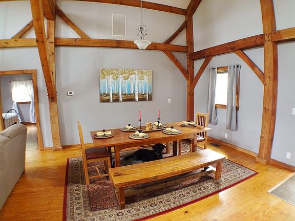 New updates completed on this rare Timber Frame home with the potential to have another bedroom and loft with a few alterations. The open floor plan has two master bedrooms and baths, one on each end of the house for privacy. The massive inside timbers, frame the rooms with a rich look from the pine floors to the cathedral ceiling w/ beams. You will want to entertain and show off this fabulous great room with room for all your friends and family. Repairs have been done to the home, including new interior paint,new door and a new updated look. The deck and front porch will soon be power washed, painted and move in ready. Your four legged friends will enjoy the sprawling back yard w/fenced area & a view to enjoy from your deck after a long day. You and work from home with great internet and cell service. Timber frame homes are very expensive to build so this is a great deal without the hassle of building.