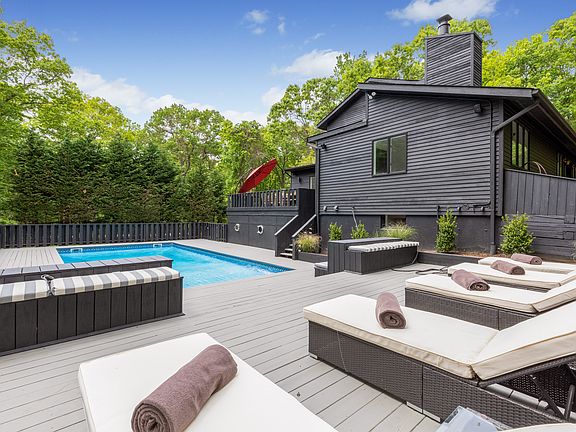 Enjoy this newly renovated designer's home for the summer. This sophisticated home offers all of the best amenities! Viking and Subzero appliances anchor the professional chef's kitchen. Eat at the beautiful marble island or enjoy meals in the dining room. En-suite master bedrooms on both the first and second floor. There are four en-suite bedrooms. Two additional bedrooms share a private bathroom. The generous great room extends into the living room with a wood burning fireplace. There you can take in lovely views to the pool, hot tub and outdoor dining. This multi level home offers plenty of common space and many "play" areas for a family to spread out and be comfortable. The expansive lower level walks out to the pool and has common space, media room and laundry room. No detail has been overlooked! This is the perfect Hampton's home!