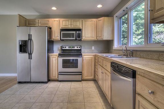 2006 Custom Contemporary Cape w/ full dormer featuring 1st floor w/ fabulous eat-in kitchen w/ maple cabinets, granite tile counters, breakfast bar, stainless steel appliances, slider to deck & tile floor open dining room w/ hardwood floor, spacious living room w/ hardwood floor & half bath w/ laundry, 2nd floor w/ master suite w/ walk in & master bath, 2 more bedrooms & 3/4 bath, full daylight basement includes finished family room & utility room plus farmers porch, paved driveway, & large level backyard all on .57 acre lot in nice neighborhood.