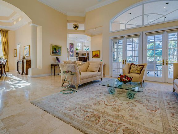 FALL IN LOVE experience the best lake views from this fabulously remodeled, 4BR open floorplan home with incredible ambiance and breathtaking southern exposure. Volume ceilings and light from all directions make the home cheerful and bright. Expansive windows allow this amazing view to shine through all day long. Outdoor living at its finest: southern exposure, private yard, screened-in pool, spa, cabana bath, and outdoor bar area. Top-of-the-line materials in this remodeled home include marble floors, crown molding, coffered ceilings, granite, newer roof, and stainless steel appliances. The rare circular driveway is perfect for entertaining. Purchase of a golf membership is required.