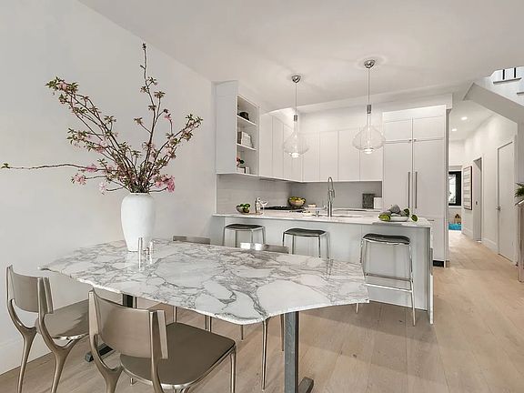 Welcome to your new home at 83 Saint Marks Place in Park Slopea stunning 3-bedroom, 3-bath duplex designed for both comfort and style. The main entry level boasts a spacious living and dining area, illuminated by three large south-facing windows that flood the space with natural light. This inviting entertaining space seamlessly connects to a beautifully renovated kitchen, featuring top-of-the-line paneled appliances and a sleek wraparound quartz countertop with a waterfall edge. Toward the back of this level, you'll find two well-appointed bedrooms. The primary bedroom includes two generous closets, a dressing area, and an en-suite bath. A second full bathroom and a laundry closet with a washer and dryer complete this floor. Upstairs, the expansive en-suite bedroom features a walk-in closet and access to a private north-facing terrace. Adjacent to this space is a versatile office or den area that opens onto a south-facing terrace. From here, a staircase leads to your private rooftop deck, offering breathtaking views of Downtown Brooklyn and the Manhattan skyline. The home is also equipped with central air-conditioning for year-round comfort. Ideally situated between 4th and 5th Avenues, 83 Saint Marks Place places you in the heart of Park Slope, just moments from the many train lines at Atlantic Terminal, offering easy access to the rest of the city.