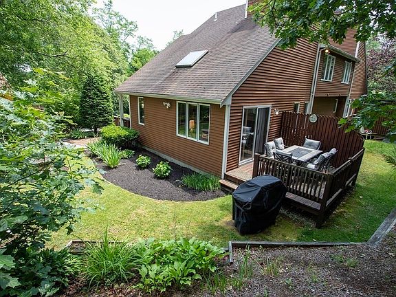 Unique downtown location, set back in a quiet, bucolic setting. Buyers will be surprised by this charming 2 level condo with private side yard abutting conservation land. Open living/ dining combo with a wood burning fireplace and updated kitchen area, second bedroom, updated full bath and slider to a private deck round out the first floor. Second floor boasts another full bath and primary bedroom with double closets. Soaring ceilings and lots of natural light. Close to downtown restaurants, shops and historic waterfront. Nelson Park Beach less than a mile away, Long Beach less than 2 miles. Convenient to Rtes 3 & 44 for commuting. Don't miss this one!