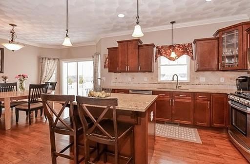 This impeccably kept Colonial features soaring ceilings, gorgeous large kitchen with island seating, custom tile backsplash, stainless steel appliances and gas cooking! Hardwoods throughout the first floor, first floor laundry room and extra bonus family room with custom built in entertainment center and cathedral ceilings! Private master bedroom suite with separate double vanity bathroom. Central air, new composite rear decking and a jaw dropping rear patio with custom built in grill and stone fireplace!