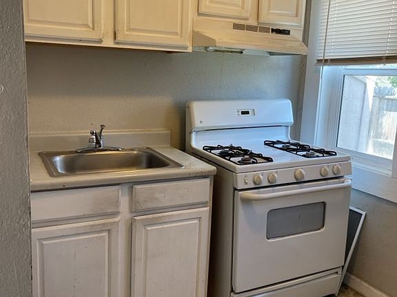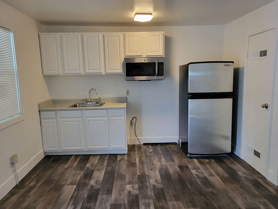 Studio with laminate flooring, Stall shower, gas range. Open backyard area.