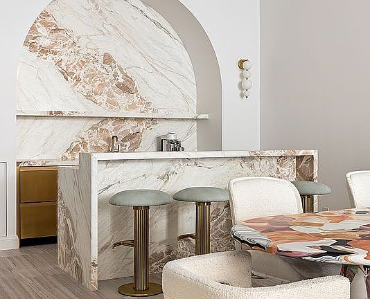 The journey begins in the grand great room, where soaring ceilings and dramatic windows over Spring Street offer a true "WOW EFFECT", and a natural backdrop for art, gatherings, and conversation. At its heart is a Milo Workroom sofa in Holly Hunt fabric and a bespoke Kooij table, crafted in Paris - both available to purchase with the home - paired with a Calacatta Vagil Oro custom bar that turns cocktail hour into theater.