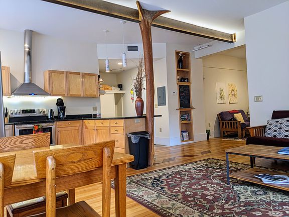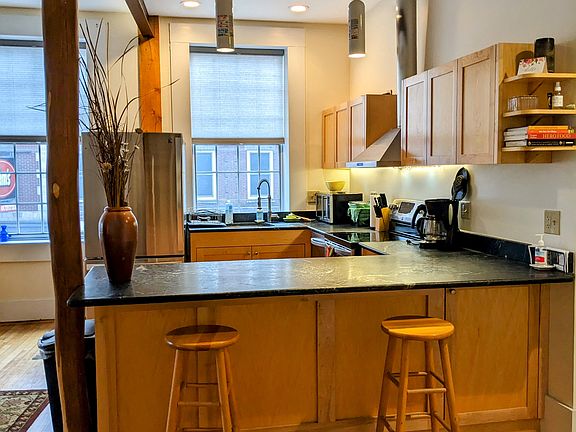 Located in a historic brick building with controlled access entrance, this beautifully renovated apartment is a serene retreat located in the bustling town of Brattleboro. This in-town flat has a large, airy living room with high ceilings, gleaming wood floors and expansive windows overlooking Main Street. A separate television/reading area opens to a spacious bedroom with built-in cabinetry and ample storage. A chef's kitchen with custom Vermont cabinetry, updated lighting, soapstone countertops and a breakfast bar. A charming antique door leads to a bathroom with a seamless glass walk-in shower complete with intricate custom tilework. This unit is filled with Vermont artistry and craftsmanship, including an inverted tree used as a decorative beam! Centrally located near restaurants, shops and art galleries. This is a non-smoking, pet free unit. Full rent is $2,635.00, discounted to $2,395.00 with on-time rent payments. Building has coin-operated laundry on-site, and nearby covered town parking. Owner pays water and trash, tenant is responsible for electric. Building wifi is available for $50 per month, or tenant may obtain their own.