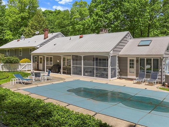 Quintessential New England red barn is the focal point of this bucolic 3 acre property. Sprawling 3 BR 2.5 bath country home is immaculately maintained and has been newly painted. LR has fpl, picture window & HW flr; formal DR has picture window & HW flr; beamed stone & redwood FR w/ fpl connects to a screened porch. There is a magnificent sunroom w/vaulted ceiling and walls of windows overlooking a heated, in ground pool and rolling lawn ringed by mature trees and beautiful landscaping. The all white kitchen has ample cabinets & prep space and half bath. The enormous MBR suite has double closets, a large ensuite bath and windows on 3 sides for natural light. Two other bedrooms have HW flrs serviced by a hall bath. Huge walk up attc. The lower level workroom/office could easily become addtl heated living space but has been used as an office for years. Cul de sac location proximate to open space hiking, blueberry picking, horse trails, town swimming hole, Little League field, the Apple Barn and the Bluebird Inn. Just 4 miles to the Merritt Pkwy and less than 1 mi to Rt 136 for easy commute to Westport and south. Enjoy a little piece of heaven every day in this friendly neighborhood.