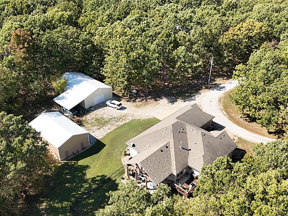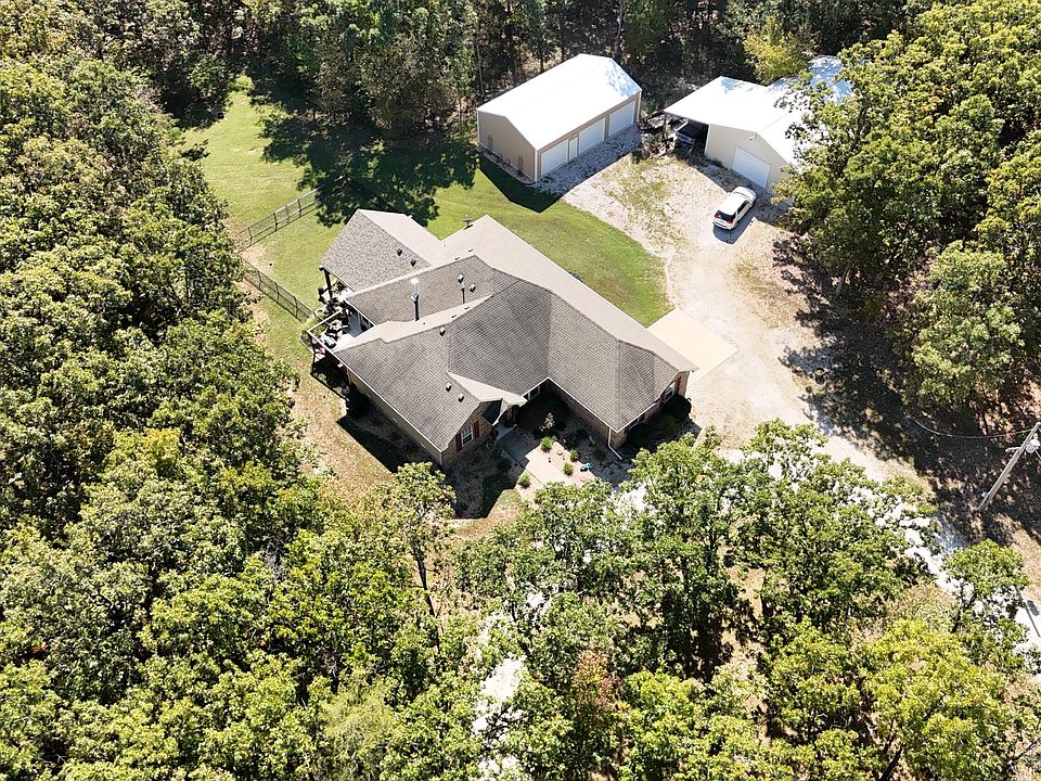 5 ACRES - PARKLIKE SETTING! Nestled among the trees is a beautiful 4 bedroom, 3 bath, 2 living areas home. Engineered hardwood is in all the main areas of the home & the bedrooms have carpet. The inviting entry leads into a spacious living room with a tray ceiling & a 2 sided gas fireplace. To the right of the entry is the formal dining area with a lot of natural light. Who wouldn't want to cook in the kitchen! Plenty of cabinets, granite countertops, stainless appliances, a breakfast bar, and a casual dining area. The master bedroom has a tray ceiling, and the en suite bath has a double sink vanity, a walk in shower, a large tub, and a nice walk in closet. There is a 2nd bedroom is on this side of the house. The 3rd bathroom has a walk in shower & can be accessed from the bedroom or the family room. The family room has the other side of the 2 sided fireplace. Bedrooms 3 & 4 are off the living room - as is the hall bath. From the family room, the exit leads to a deck, which leads down to the awesome covered patio area. This is a fantastic entertaining area & overlooks the large back yard. A portion of the back yard is enclosed with a black metal fence. Not uncommon to see the deer in the back yard! The 30 x 48 shop has concrete floors & is insulated & has a carport attached. A 24 x 40 detached 3 car garage just seals the deal on this property! The proximity to town makes this location desirable, and it is definitely a move in ready home!